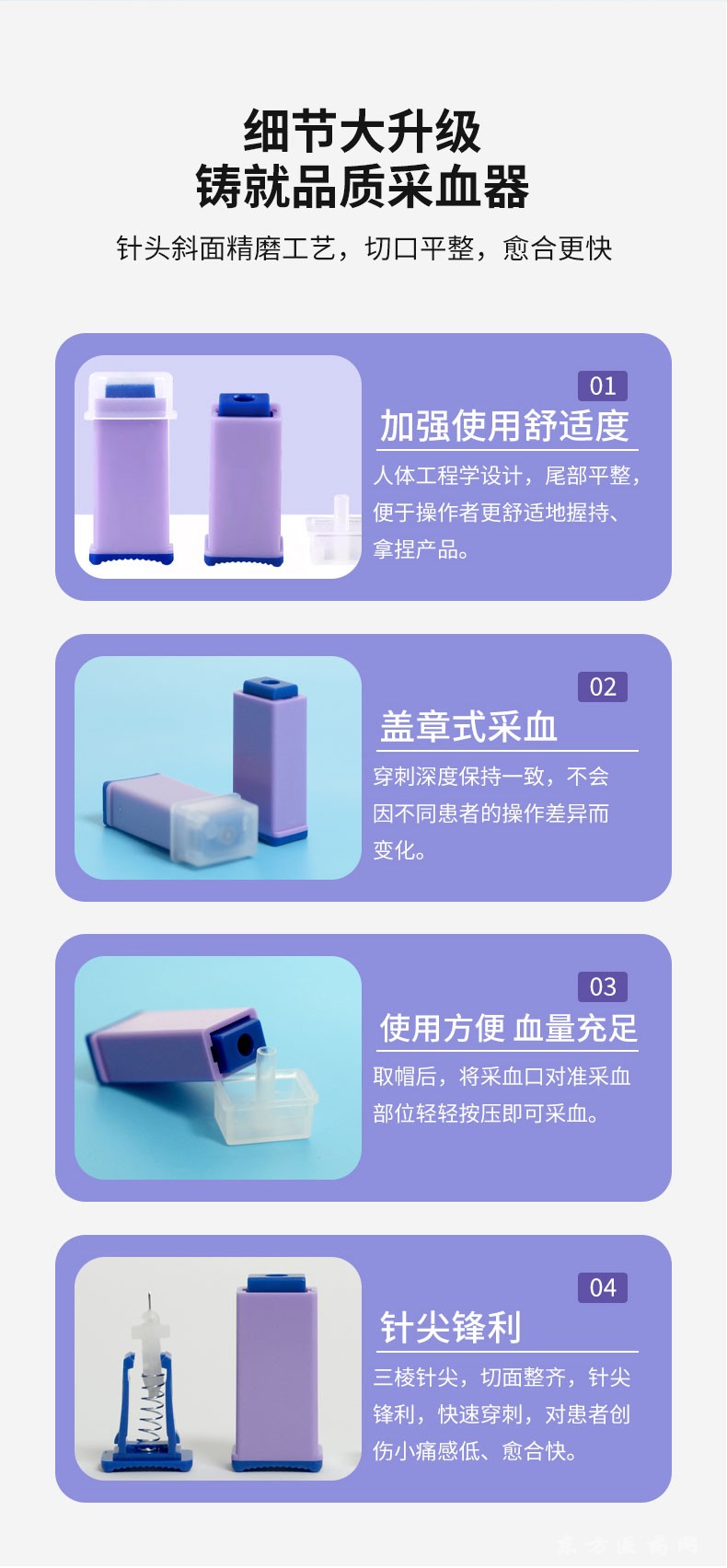 | 备注 | 1.检查包装是否破损,护帽是否脱落;2.打开包装,取出末梢采血器;3.取下保护帽,对准已消毒需采血的部位按压末梢采血器尾盖。 |